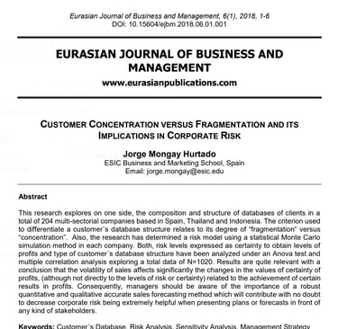 Monray Hurtado, J.(2018). Customer concentration versus fragmentation and its implications in corporate risk. Eurasian Journal of Business and Management, 6(1), 1-6. DOI Https://doi.org/10.15604/ejbm.2018.06.01.001.