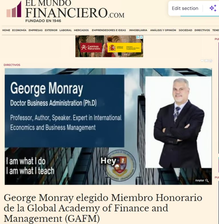 El profesor Internacional de Economía y Empresa Dr. George Monray ha sido nombrado miembro Honorario de la Global Academy of Finance and Management (GAFM). Reseña aparecida en 30 medios españoles