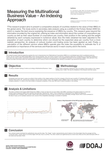 Mongay, J. (2018). Measuring the multinational business value: An indexing approach. Expert Journal of Economics, 6(1), 1–14. Retrieved from https://economics.expertjournals.com/23446749-604/. Index: DOAJ, Econlit, Econpapers.