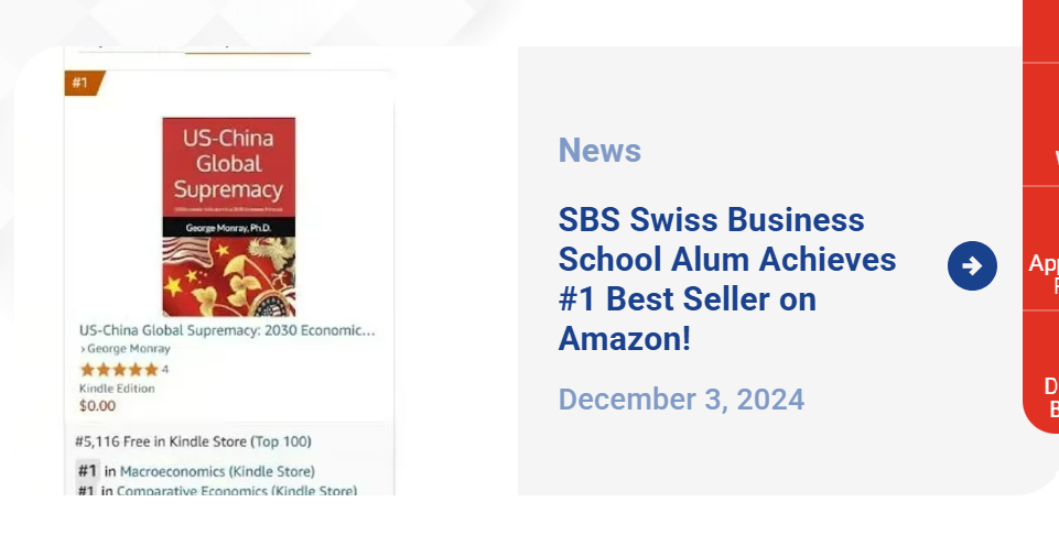 Swiss Business School University of Applied Sciences Institute praises the achievement of professor George Monray with his AMAZON #1 Global Sales of the Book: US-China Global Supremacy—a 2030 Forecast. (Comparative Economics and Macroeconomics sections)